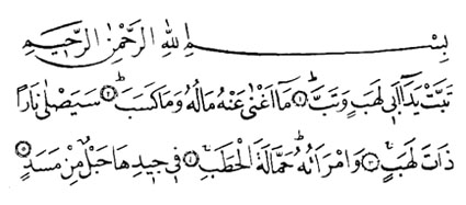 Okunuşu: Tebbet yedâ ebî lehebin ve tebb. Mâ eğnâ anhü mâlühû ve mâ keseb. Seyeslâ nâren zâte leheb. Vemraetühû hammâletelhatab. Fî cî dihâ hablün min mesed.