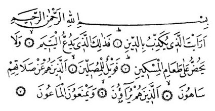 Gördün mü o, dîne (ceza gününe ve âhirete) inanmayanı? İşte hak dîne ve ceza gününe inanmayan, o kimsedir ki: Öksüzü itip kakar, çâresizin ve yoksulun yiyeceğine dair teşvikte bulunmaz; ne kendisi doyurur, ne de başkalarının doyurması için kayırır. Vay o namaz kılanların haline ki, onlar namazlarını gereği gibi ciddî bir vazife olarak yapmazlar. Onlar ki gösteriş için yaparlar ve yardımlığı sakınırlar (kimseye bir damla şey vermek istemezler.)